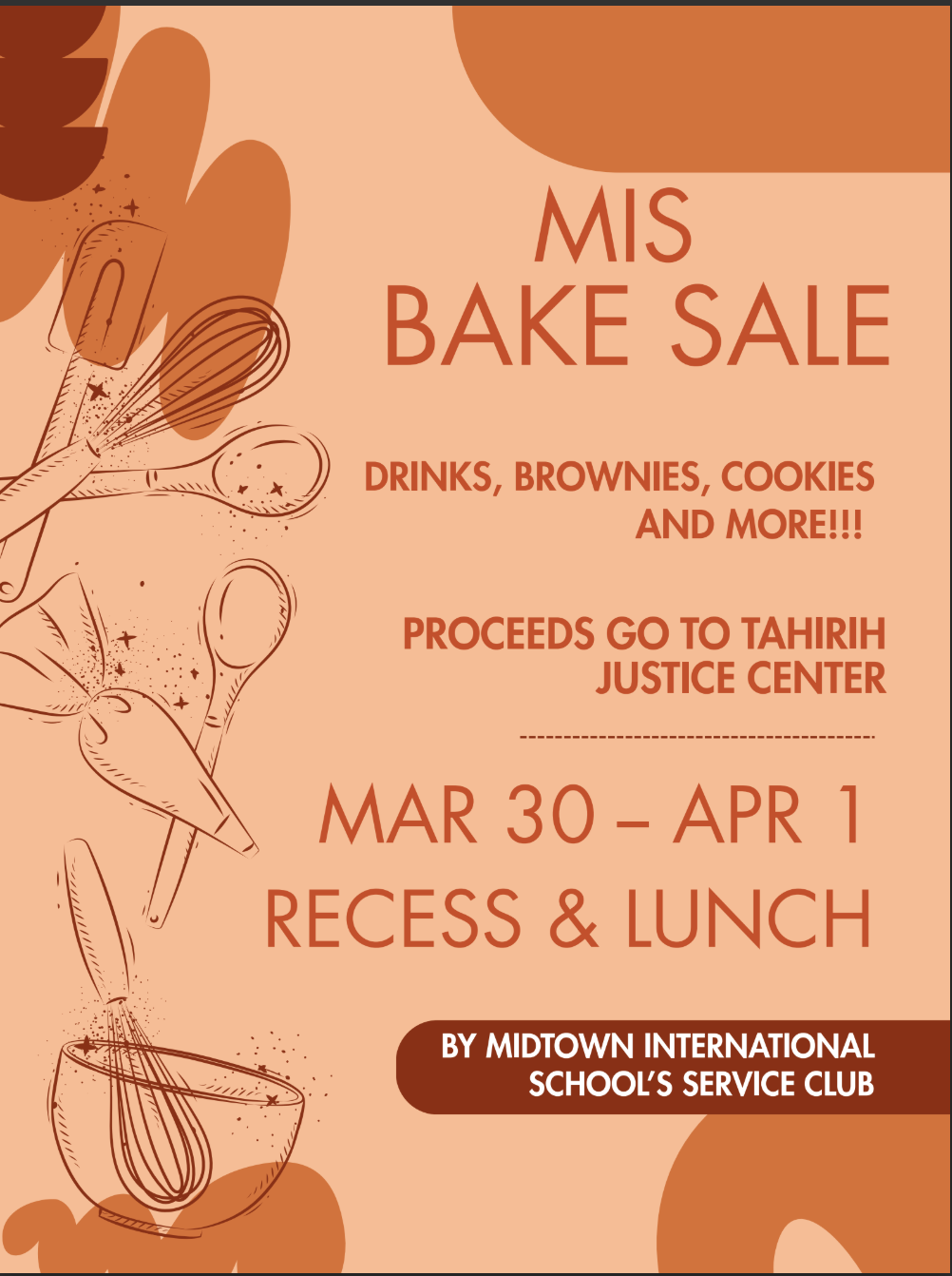 MIS Service Club is having another Bake Sale! Monday March 30 through Wednesday April 1st, we'll be selling baked goods and juice by the front desk. All proceeds will support legal assistance for immigrant and refugee women through the Tahirih Justice Center.