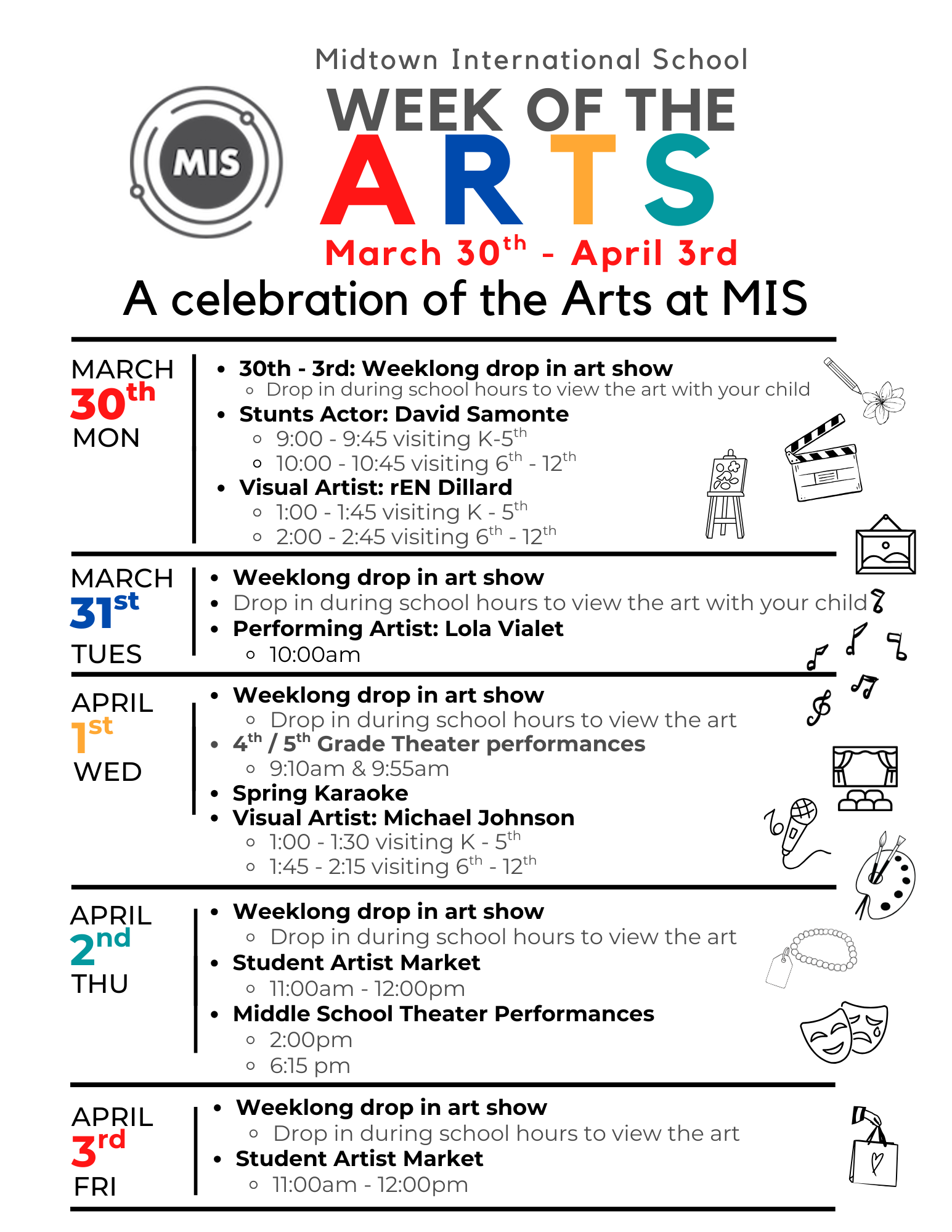 Monday, March 30 - Friday, April 3- Week of the Arts